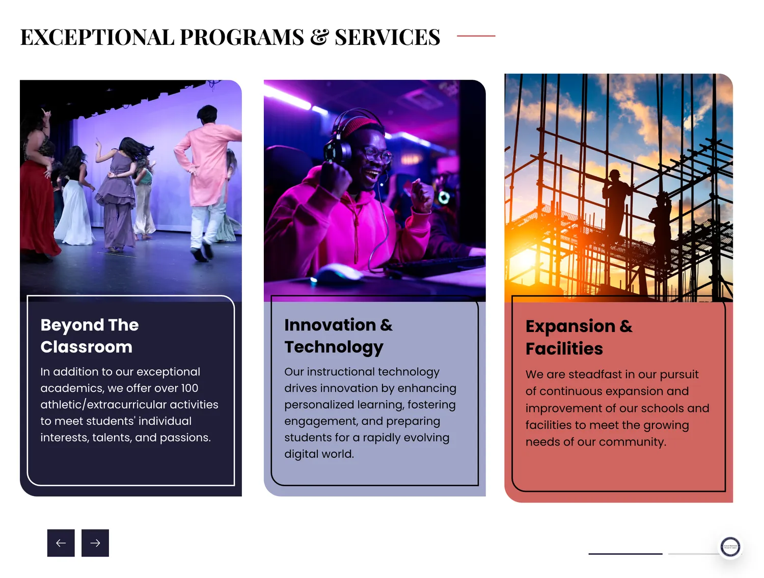 Core Offerings: Brief descriptions of academics, outstanding extracurriculars, culture and equity initiatives, and community partnerships. Highlight two to three defining programs (dual language, career pathways, SEL).