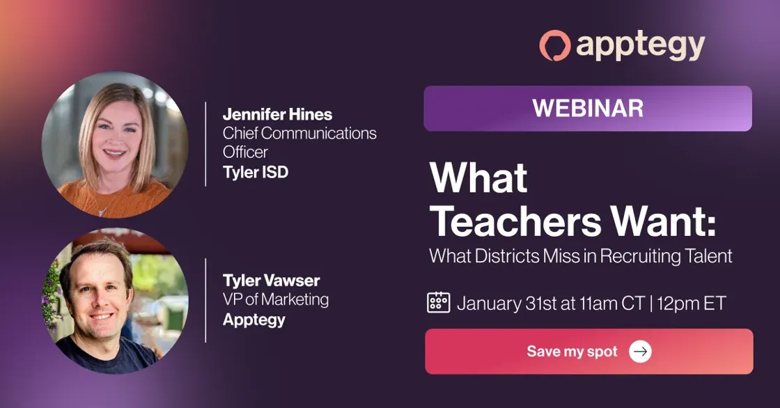 1. Teacher shortages aren't new to school leaders. Yet, now more than ever, teacher recruitment and retention is a key priority for the success of your schools. Join Apptegy's VP of Marketing Tyler Vawser and Tyler ISD's Chief Communications Officer Jennifer Hines for a deep dive into what districts miss in recruiting talent. Watch our next webinar here!