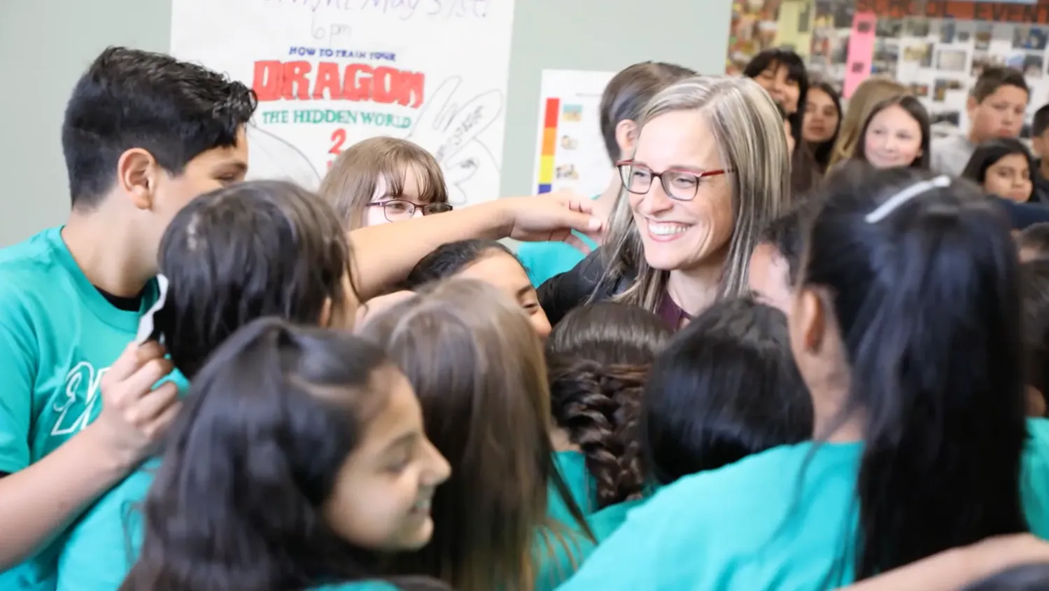 Christy Perry stands smiling among a crowd of students.