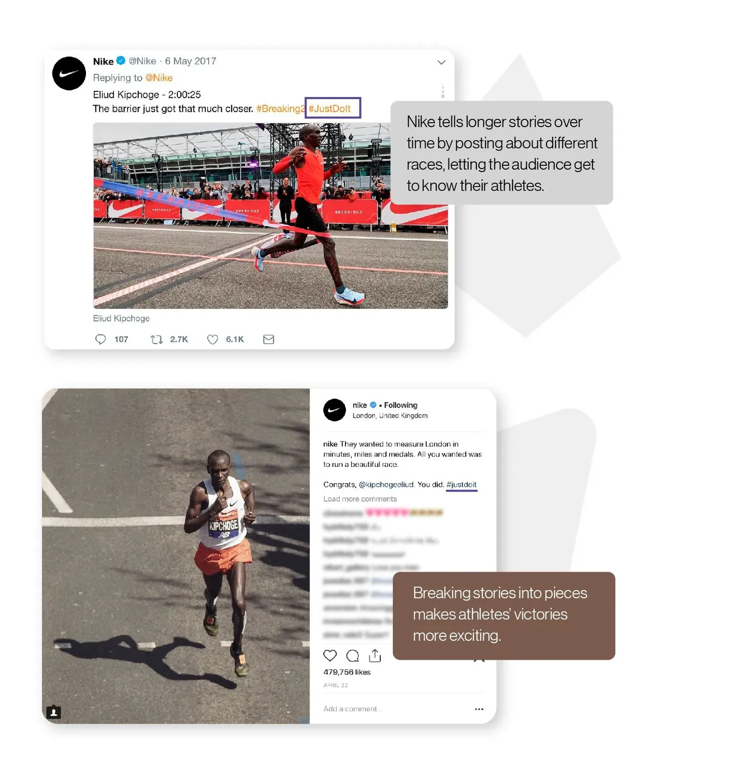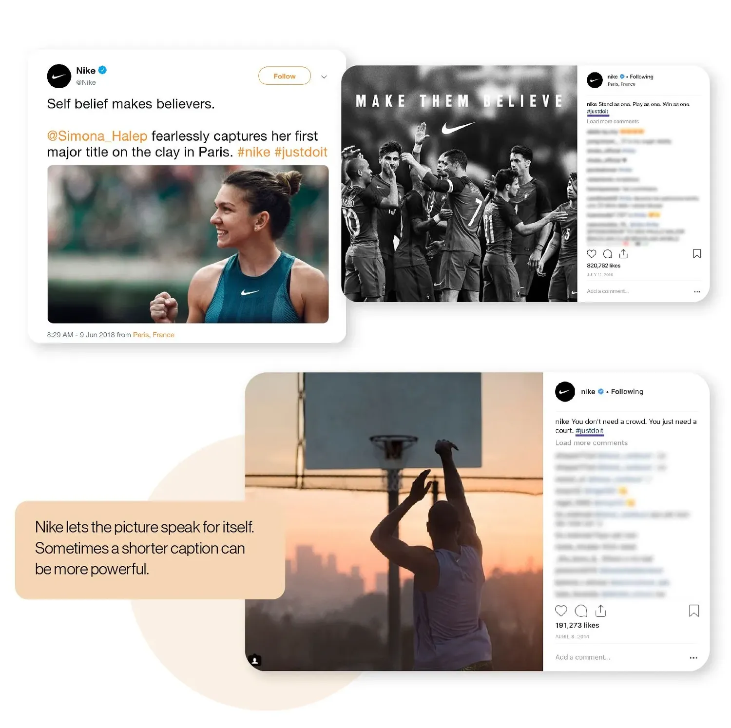 With Nike, each post is an opportunity to paint the company’s vision. The brand attaches its #JustDoIt hashtag to inspiring athletes’ stories, keeping content fresh while maintaining the Nike brand and relating it back to the company’s core message of offering the perfect shoe for athletes. Depending on the sports season, Nike also shares updates about different athletes’ games and races as they correspond with the company’s messaging. Nike also crafts posts that are meant to inspire, thereby fitting into its overall branding narrative. The company inspires athletes to dream big, then provides them with the tools to help meet those goals.