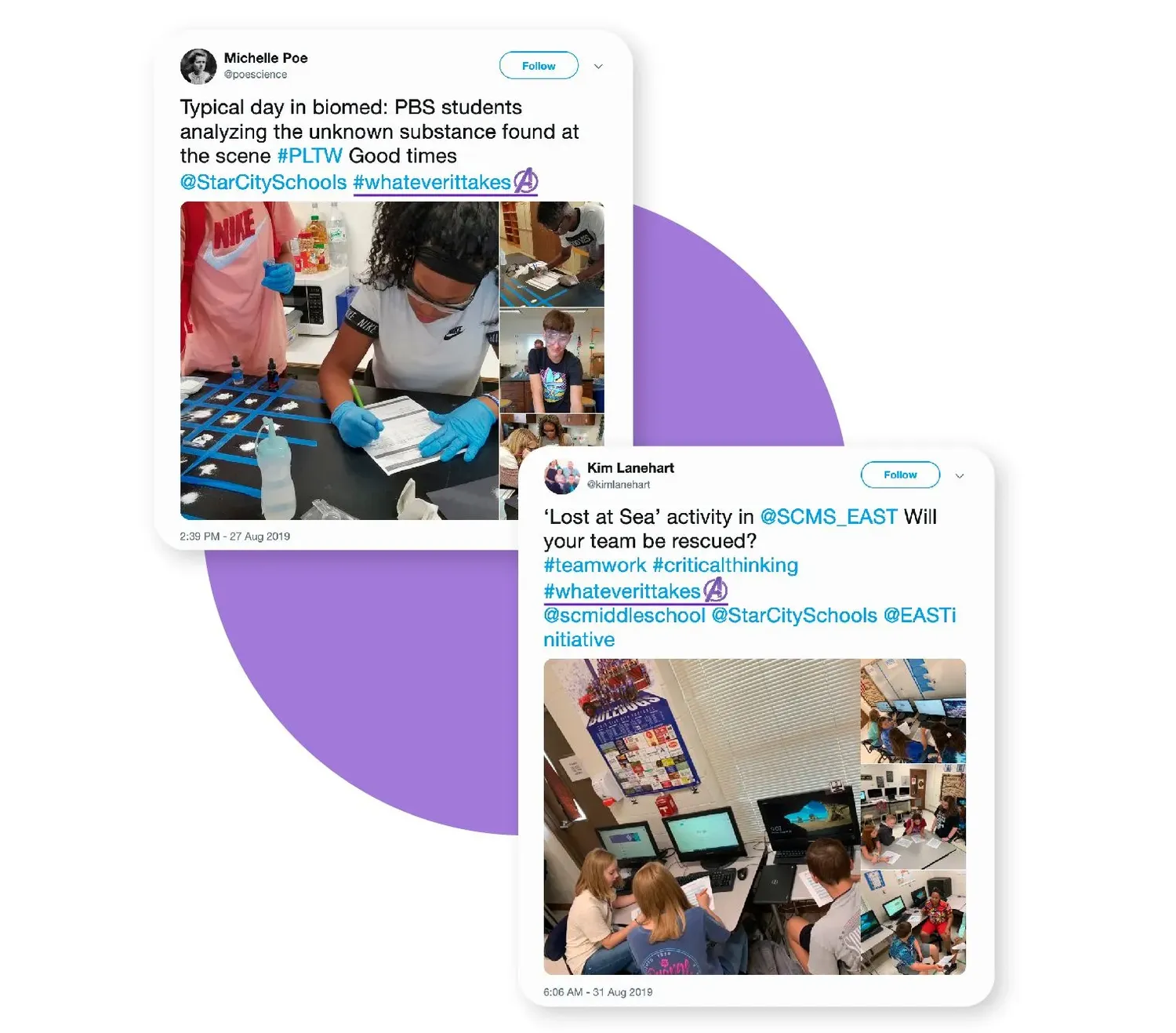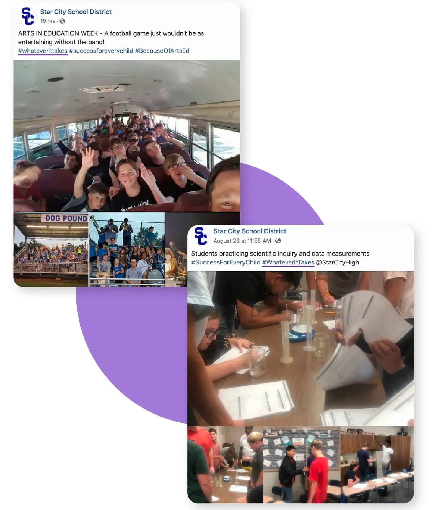 Like Nike, Star City School District in southeast Arkansas also works to inspire big dreams. This award-winning district puts students and teachers first and makes sure to show it on all their schools' social media channels. On Twitter and Facebook, SCSD shares post after post of students and staff participating in classroom and extracurricular activities on each campus. And these posts always include the district’s #WhateverItTakes hashtag to tie them back to the district brand and message. This way, posts made by teachers and staff, or even students, can all be found under one hashtag, further strengthening the brand and painting a clearer picture of the district for the outside world to see.