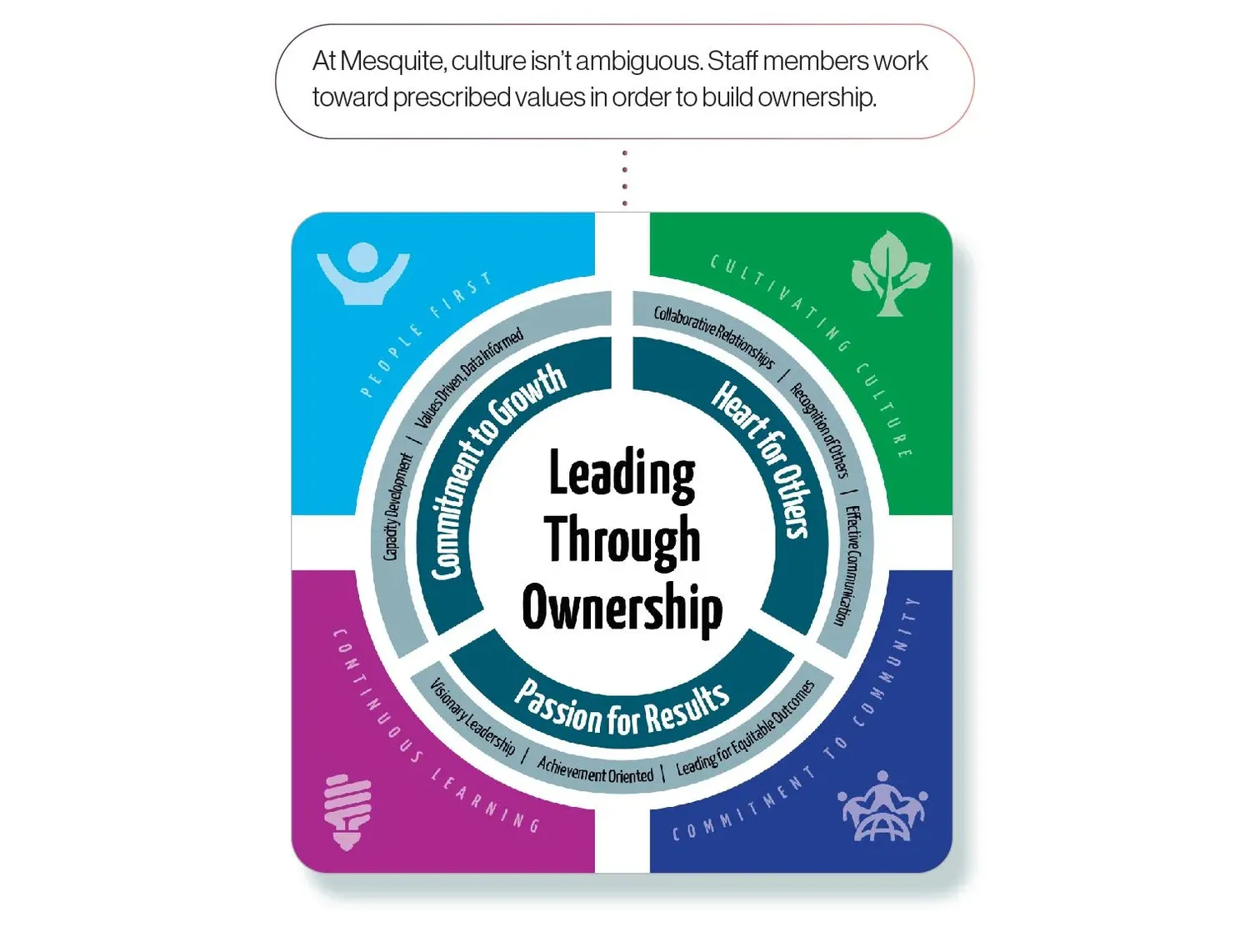 When Vroonland needs to deviate from the ownership model—to implement new programs due to COVID-19, for example—he’s upfront about it. “I overtly communicate,” he says. “I explain that it is not in line with our behaviors or values, but in order for Mesquite to respond quickly as an organization, we need to put systems in place. And I remind them: As our capacity builds around these systems, we can start backing off and decoupling from that bureaucratic structure.”