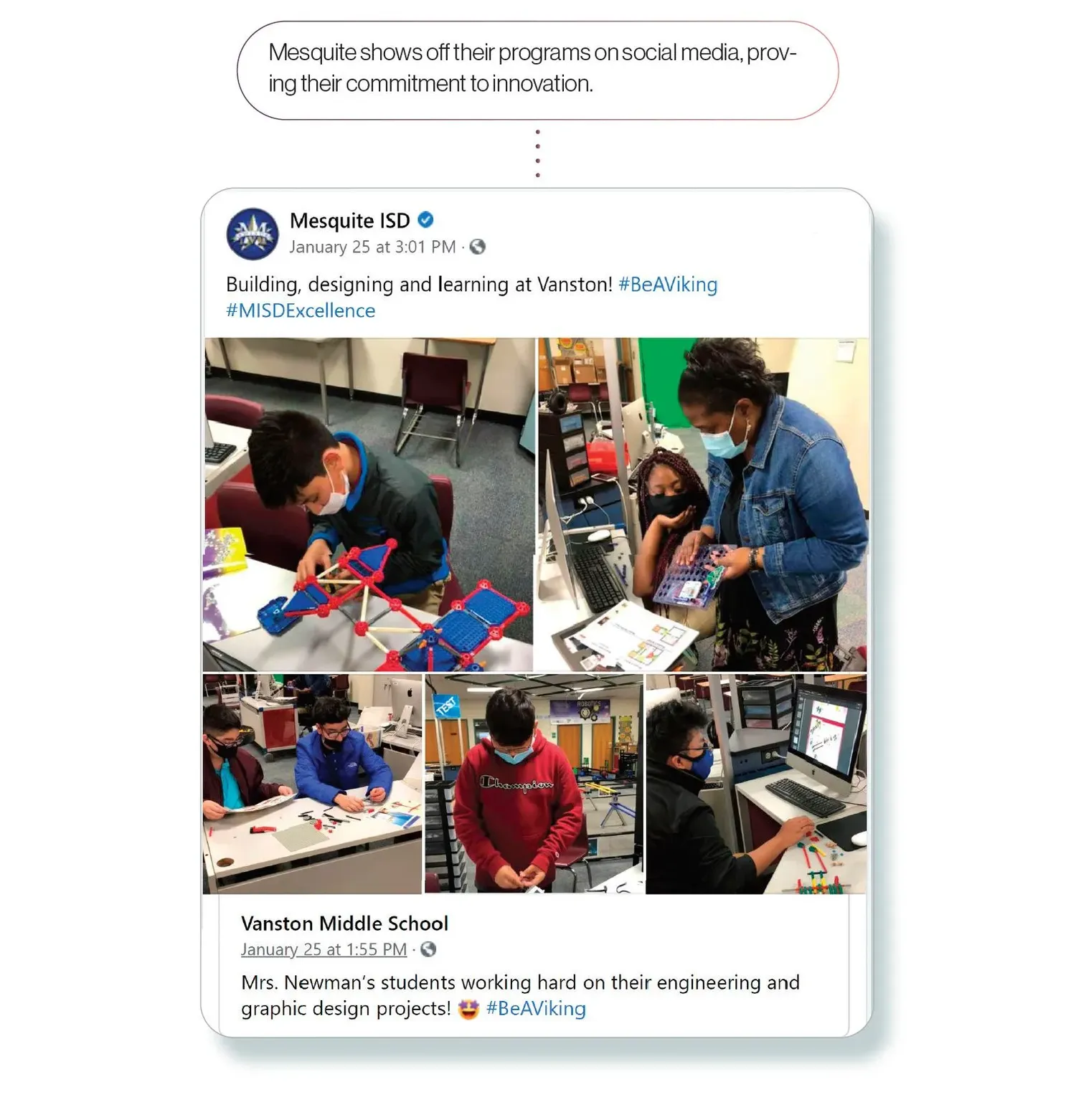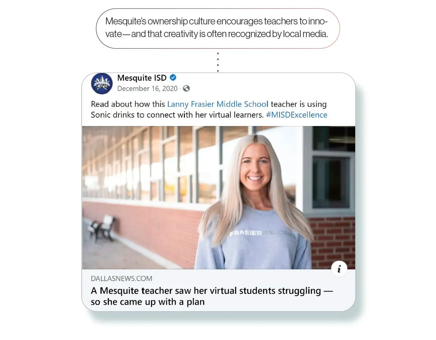 However, the disruption wouldn’t last long. “I announced that we would return to learning by Wednesday,” Vroonland says. And they did—every one of Mesquite ISD’s nearly 40,000 kids. The district hadn’t previously been one-to-one, but within a week or two, each student had a device in hand. Meal delivery was launched in under a week. For their quick work, Mesquite started gaining media attention. The creativity of the district’s teachers during the pandemic even garnered national and international media coverage on the BBC and ABC News online.