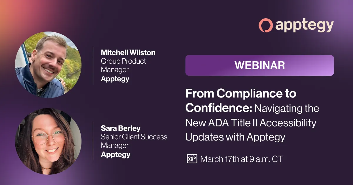 In this webinar, we'll break down what the updated guidance means for school districts and how you can begin preparing today. First, Apptegy's Mitchell Wilston will explore how the Apptegy platform supports accessible communication and ADA-aligned website practices. Then, Senior Client Success Manager Sara Berley will focus on practical steps districts can take to begin addressing accessibility across their digital presence. We’ll share common accessibility challenges districts face, where to start evaluating your website and content, and how to build a sustainable approach to digital accessibility moving forward.