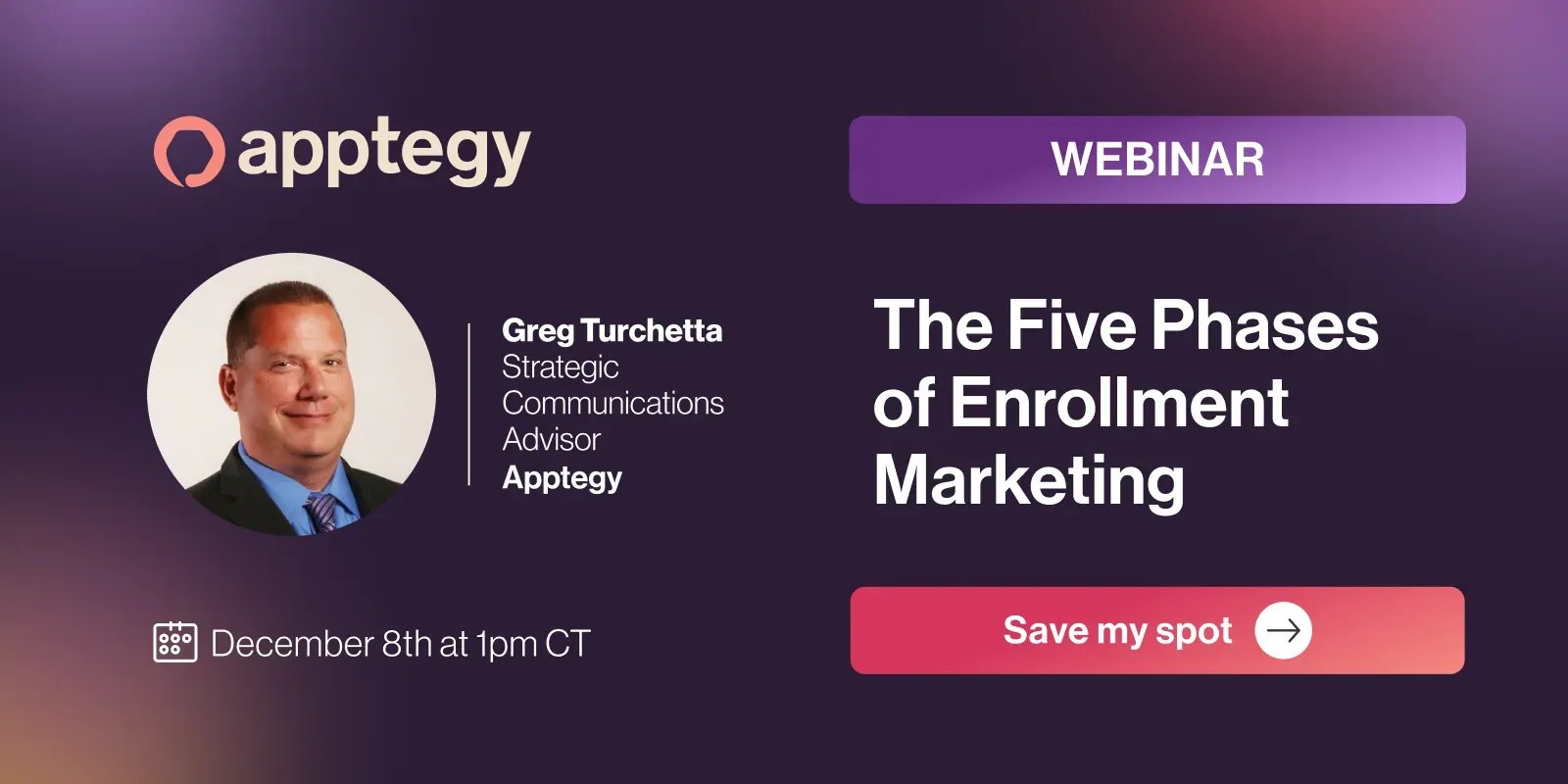 Join us on December 8th for our webinar The Five Phases of Enrollment Marketing, where you'll learn how to use the customer journey framework to craft a great experience at each step of the enrollment process.